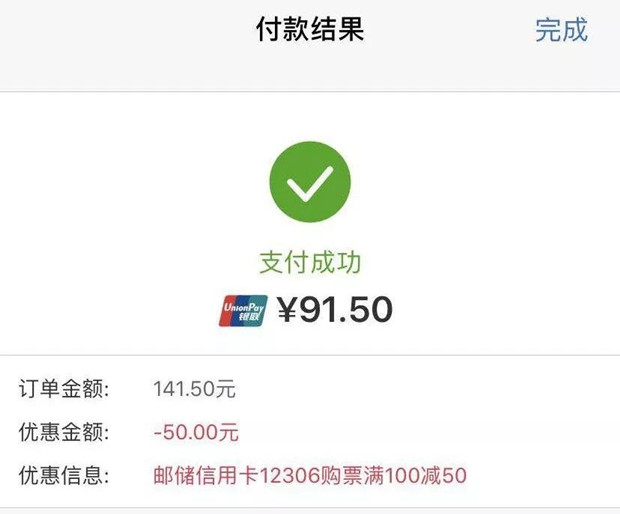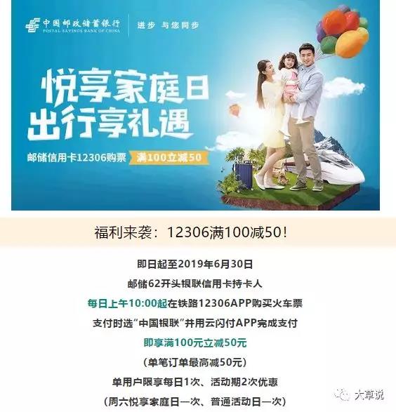 即日起至2019.6.30,在12306上用邮政信用卡支付,满100立减50。